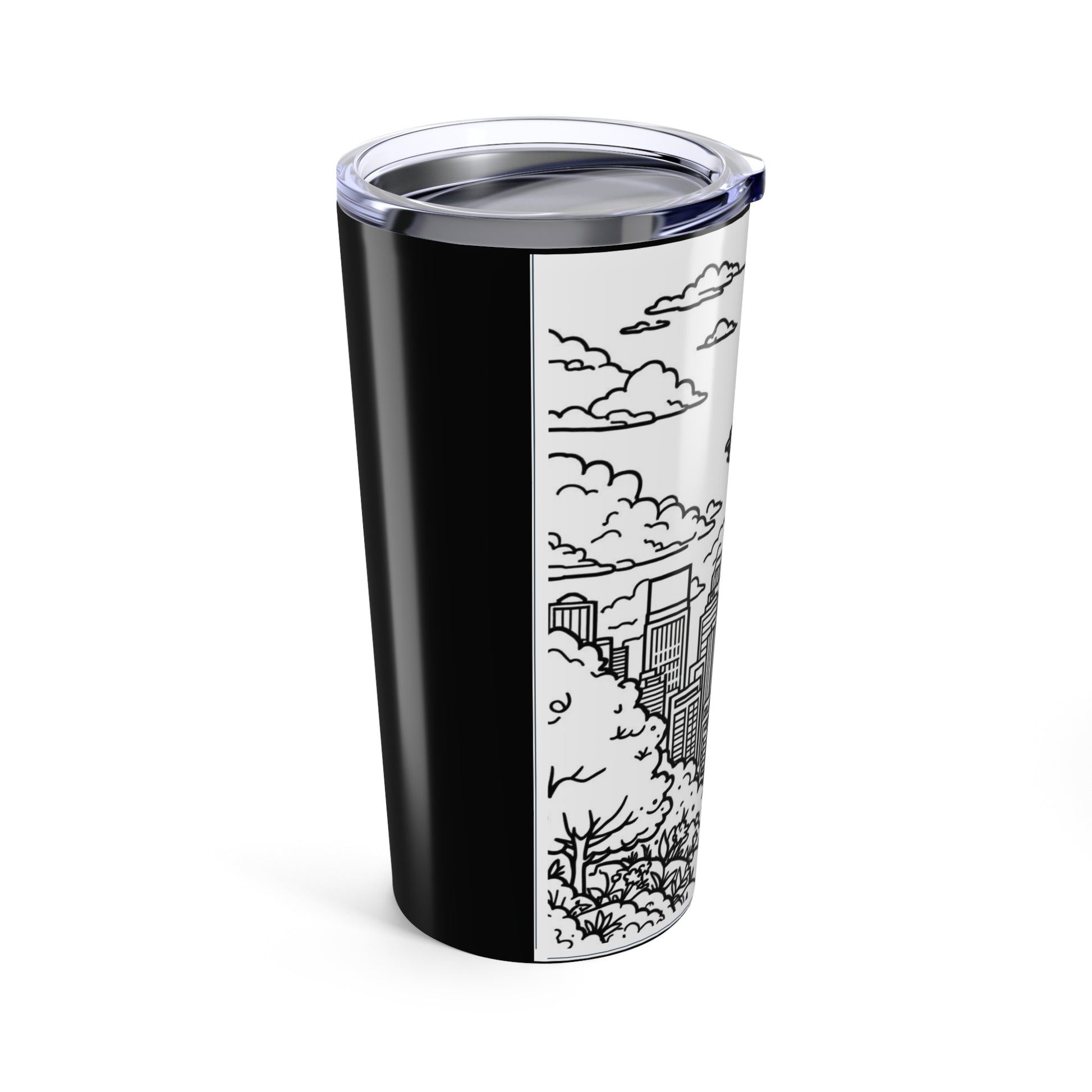 Sip city mornings with a tumbler that feels like a walk through familiar streets. This 20oz stainless steel tumbler carries a hand-drawn skyline wrap—clean black-and-white linework of towers, clouds, and the iconic tower spire—so your coffee or tea becomes part of a quiet ritual. The vacuum-insulated body keeps drinks at the right temperature while the clear push-on lid lets you peek at what’s inside. It’s smooth to hold, glossy to look at, and built to travel from commuter train to office desk or weekend park bench without fuss. For people who collect city memories and small daily moments, this tumbler blends functionality with a little metropolitan calm.